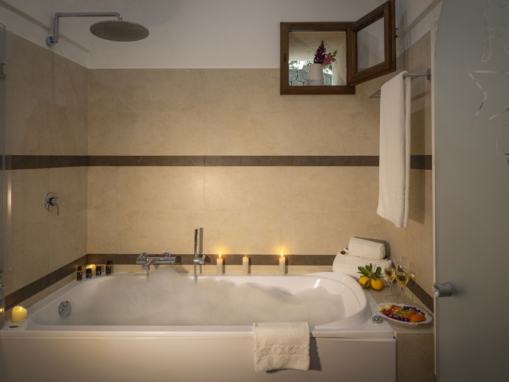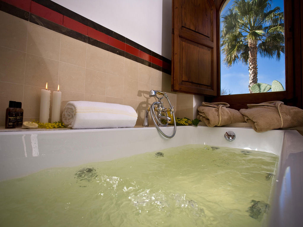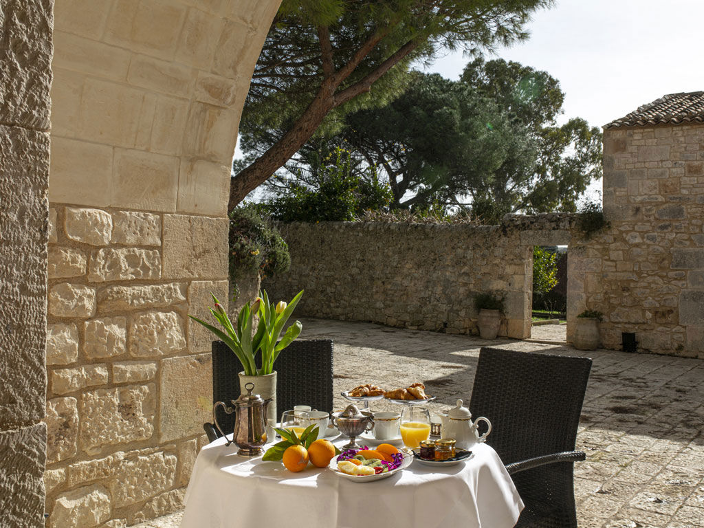 From the windows, the view opens onto the courtyard or the Hyblean Mountains, across stretches of carob trees and the faint lines of the sea on the horizon. Some rooms feature a whirlpool bathtub, perfect for unwinding after a day spent among the wonders of the Val di Noto.