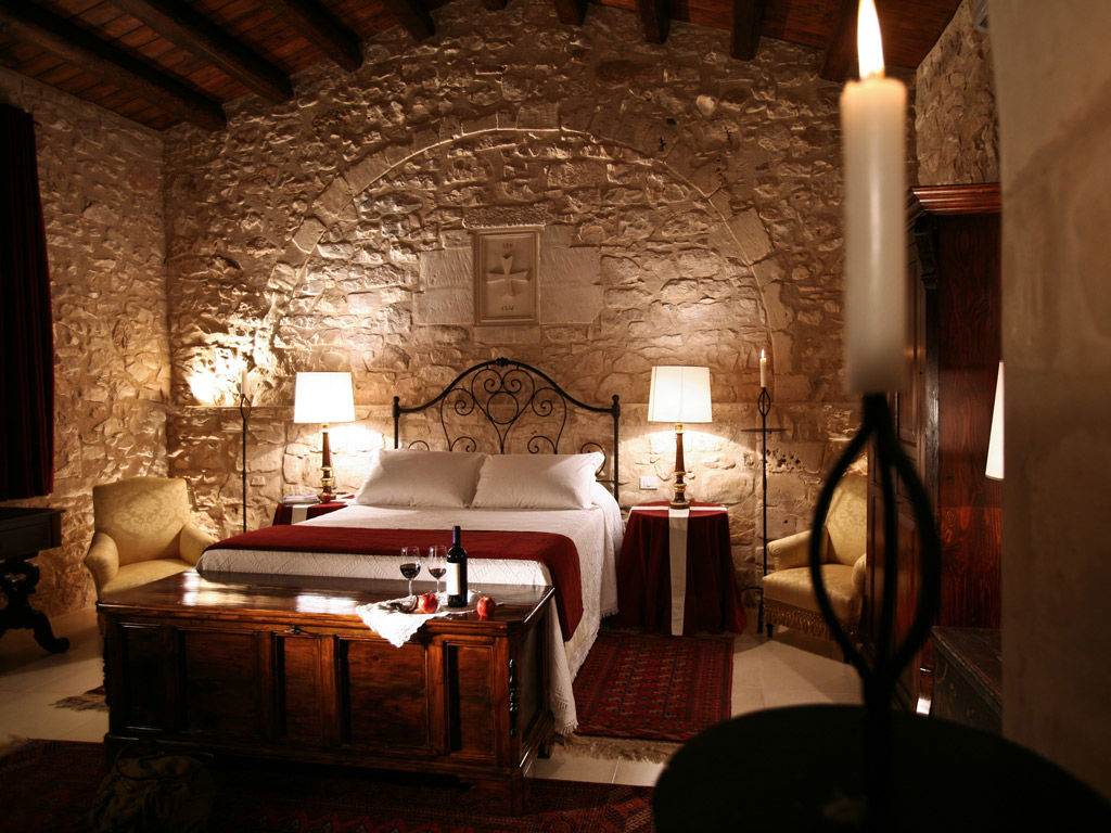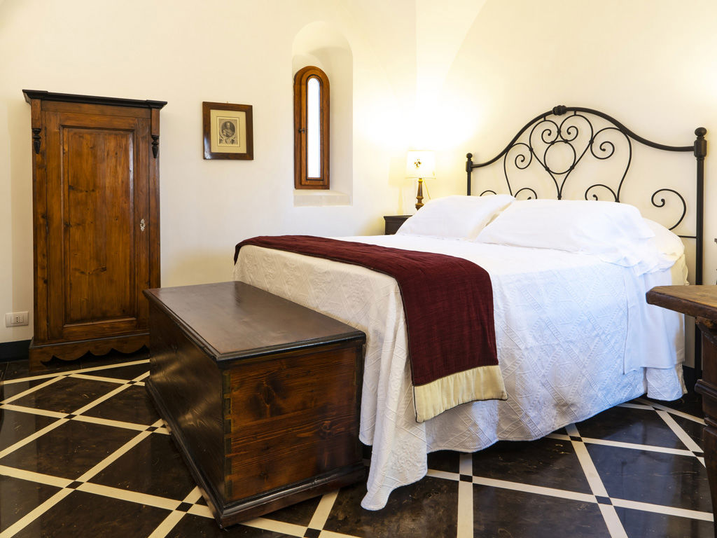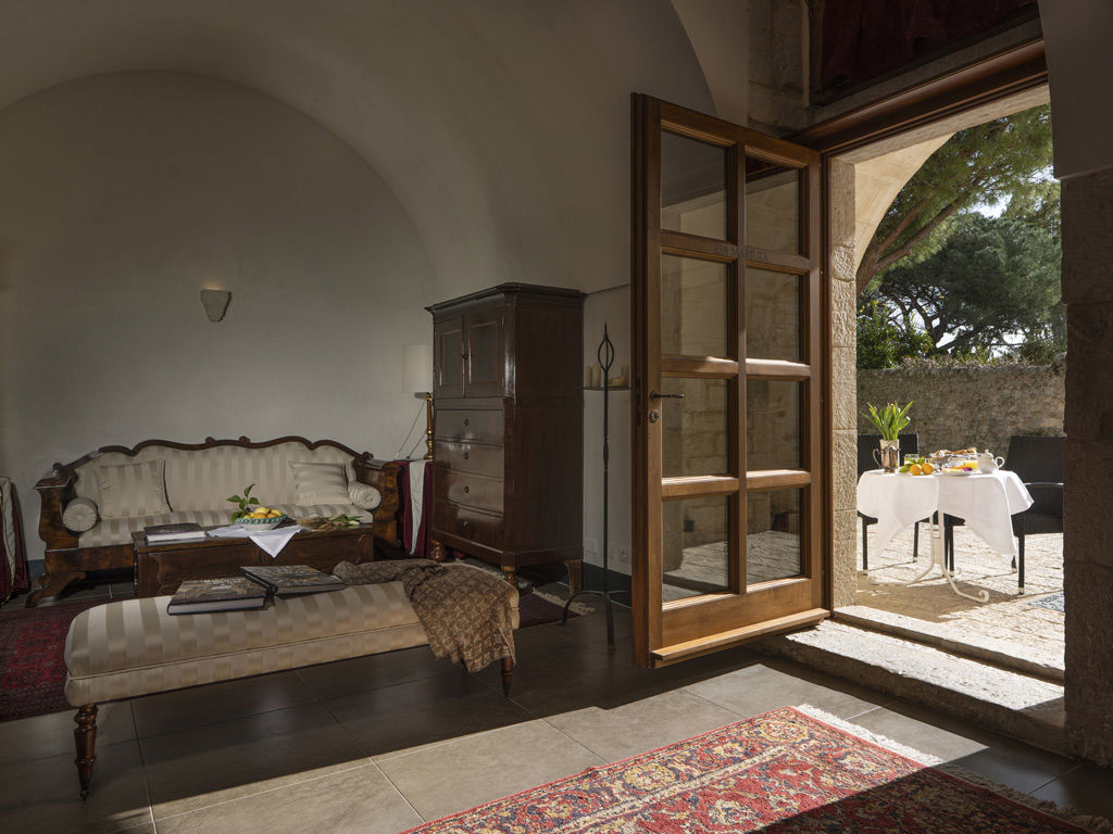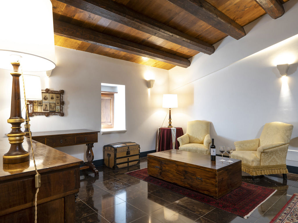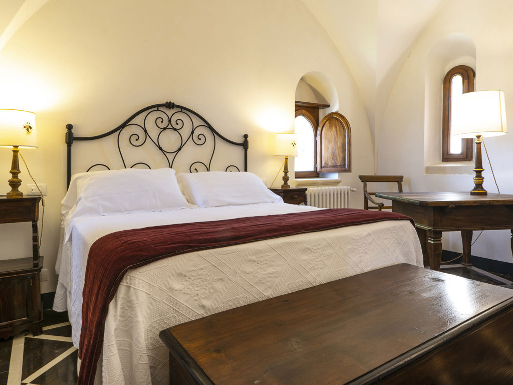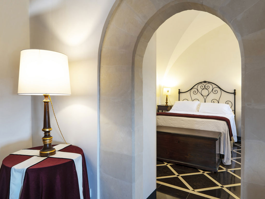 Each Junior Suite at Eremo della Giubiliana is different — like the stories it holds. These are spacious rooms, around 50 m², where time seems to have stood still: stone floors, cross vaults, rock walls, and family furnishings bring back to life the memory of the ancient settlement of the Teutonic Knights.
